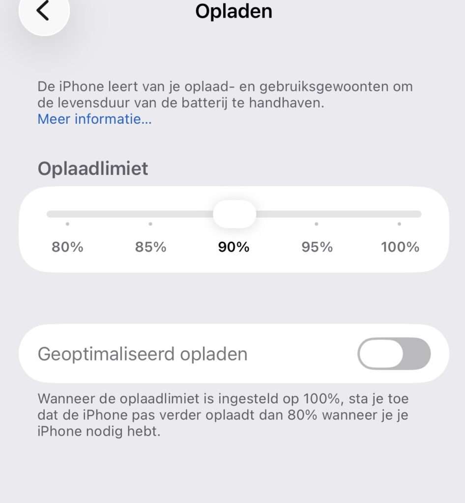 Heb je aan het einde van de dag nog ruim batterij over? Dan is tot 80% laden vaak slimmer.